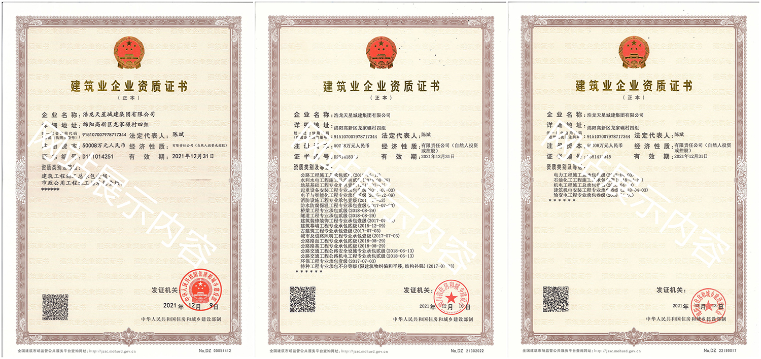 浩龍?zhí)煨浅墙瘓F(tuán)有限公司,2007年成立于“李白故鄉(xiāng)、中國科技城”—四川省綿陽市,企業(yè)注冊資本金5.0008億元。公司共有27項建筑業(yè)企業(yè)資質(zhì),其中國家一級資質(zhì)11項,二級資質(zhì)10項,三級資質(zhì)5項,特種資質(zhì)不分等級1項,類別涵蓋建筑、市政、水利、機(jī)電、隧道、起重設(shè)備安裝等基礎(chǔ)及未來發(fā)展重點專業(yè)。公司下設(shè)三個辦事處,業(yè)務(wù)范圍輻射全國,在建項目三十余個,累計完成產(chǎn)值超11億元。公司是綿陽市建筑施工企業(yè)協(xié)會副會長單位、綿陽遂寧商會會長級單位、綿陽首批建筑業(yè)綠卡企業(yè),在綿陽本地企業(yè)中綜合實力名列前茅。